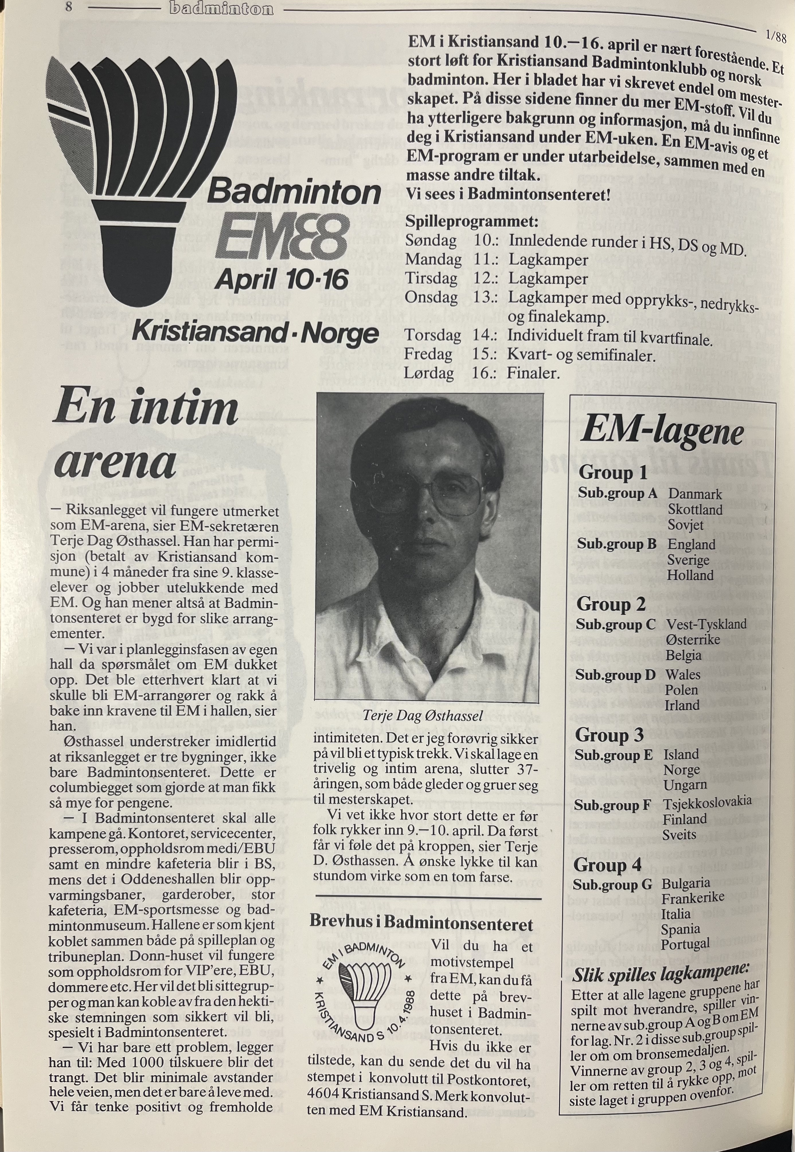 Vi har lånt den meget godt beskrivende tittelen på Kristiansand Badmintonklubbs Terje Dag Østhassel fra avisen Nye Sørlandet - som hadde et dobbeltside-intervju med ham dagen før EM i badminton for lag og individuelt ble spilt i gang i deres helt flunkende nye storstue Badmintonsenteret i 1988. Den 11. utgaven av Europamesterskapet i badminton samlet spillere fra 23 nasjoner til Sørlandets hovedstad og med Terje som EM-general på heltid med permisjon fra sin lærerjobb i fire måneder. I dag 38 år senere sier 75-åringen om den hektiske og historiske uken: