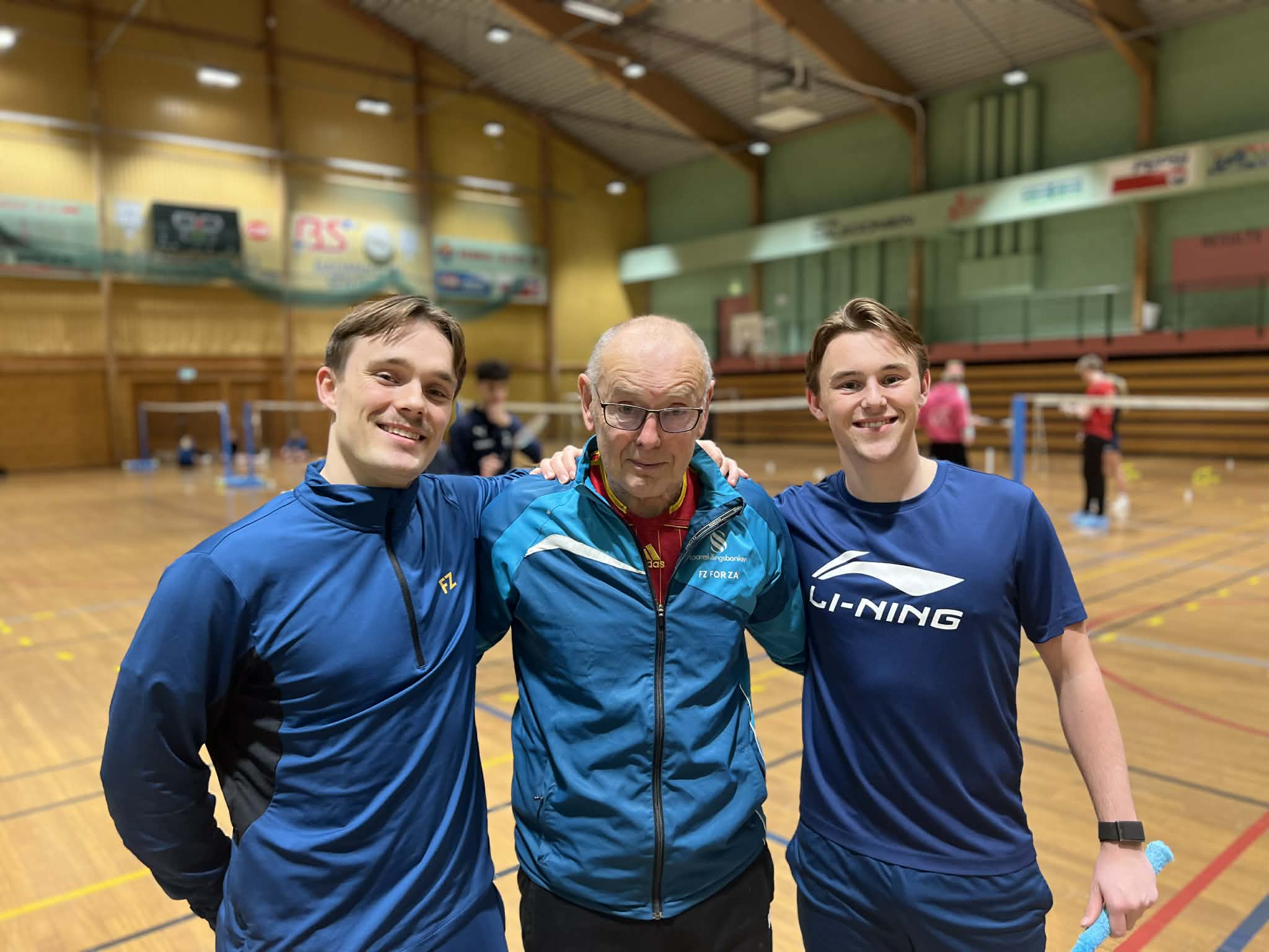 HYLLER BESTEFAR: Landslagsspillerne Jonas (t.v.) og Sander hyller bestefar Terje Dag Østhassel. Ingen tvil om hvem som er deres store forbilde både på og utenfor badmintonbanen. Foto: Helene Tjelland Abusdal.